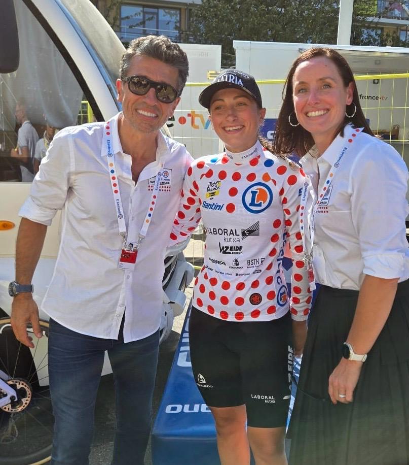Le Maillot Jaune était remporté hier par Charlotte Kool (Pays-Bas), et le Maillot à Pois par Cristina Tonetti (Italie)... Et, pour l'occasion, la remise du Maillot à Pois a été soutenue par Aurélie Macherey, adhérente E.Leclerc à Épinay-sur-Seine et nouvelle ambassadrice du Tour féminin (à droite sur la photo ?).